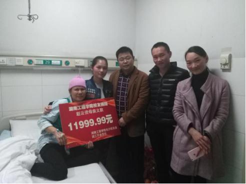 11月10日,在得知消息后,新葡萄8883官网AMG官网长沙校友协会在第一时间与张金松取得了联系。核实情况后,长沙校友会发起了“人间自有真情在,爱心捐款暖人心” 的爱心捐款倡议活动。短短四天时间内,78位校友奉献爱心,筹集善款11999.99元。11月15日,长沙校友协会代表沈永详、蔡爽、刘敏一行三人于湘雅附二医院探望了赵云资母女二人,并将善款交到她们手中。校友代表与赵妈妈亲切交谈,了解病情,经过三次化疗,病情明显好转。在校友们的爱心帮助下,赵妈妈战胜病魔的勇气和信心更加充足。赵云资及母亲对校友们的帮助表示衷心的感谢。