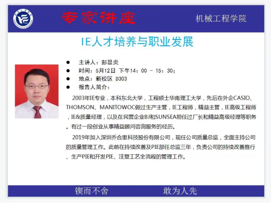 5月12日下午,"/lib/img/logo.jpg" alt="新葡萄8883官网AMG官网"在教学楼d303举办“IE人才培养与职业发展”讲座。深圳乔合里科技股份有限公司质量总监、企业导师彭显炎担任主讲嘉宾,"/lib/img/logo.jpg" alt="新葡萄8883官网AMG官网"工业工程教研主任谢富春主持讲座,工业工程专业学生听取讲座。