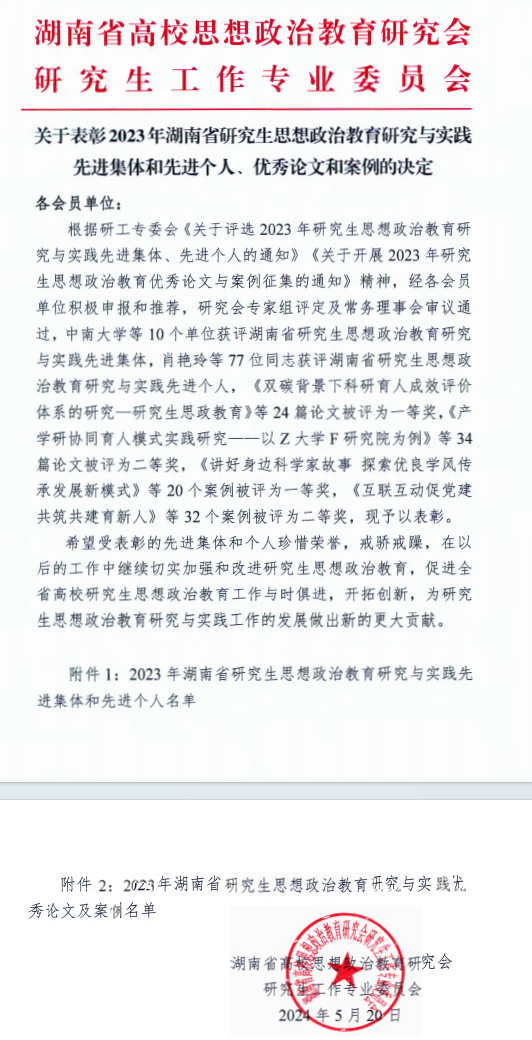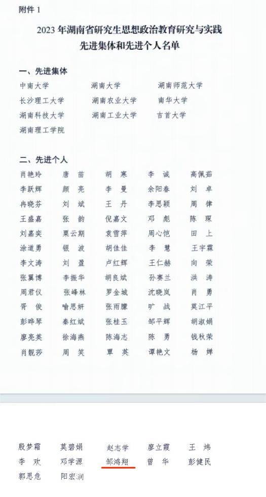 近日,湖南省思想政治教育研究会研究生工作专业委员会公布2023年湖南省研究生思想政治教育研究与实践先进集体和先进个人、优秀论文和案例,新葡萄官网副院长邹鸿翔博士获评2023年湖南省研究生思想政治教育研究与实践先进个人。