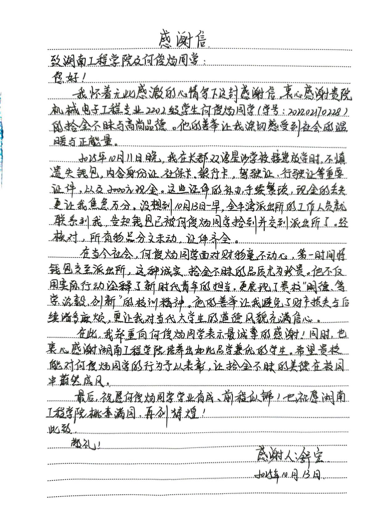 10月11日晚,何俊炀同学在返校途中捡到一个钱包,内有身份证、银行卡、驾驶证及2000元现金。在无法直接联系失主的情况下,他第一时间将钱包送至社区居委会,最终在民警协助下物归原主。失主舒先生激动地表示,第二天他正急需身份证办理重要业务,“何同学的善举真是雪中送炭!”面对赞誉,何俊炀谦逊回应:“只是做了该做的事。”他将这份自觉归功于从小接受的诚信教育与校园品德的熏陶。