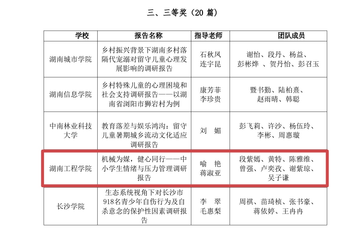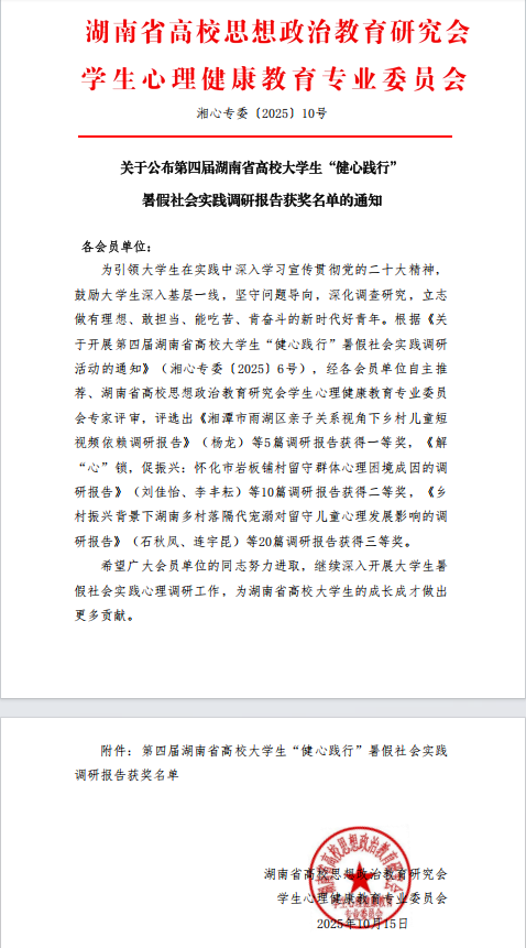 近日,第四届湖南省高校“健心践行”暑期社会实践调研报告评选结果公布。"/lib/img/logo.jpg" alt="新葡萄8883官网AMG官网"提交的《机械为媒,健心同行——中小学生情绪与压力管理调研报告》荣获三等奖。
