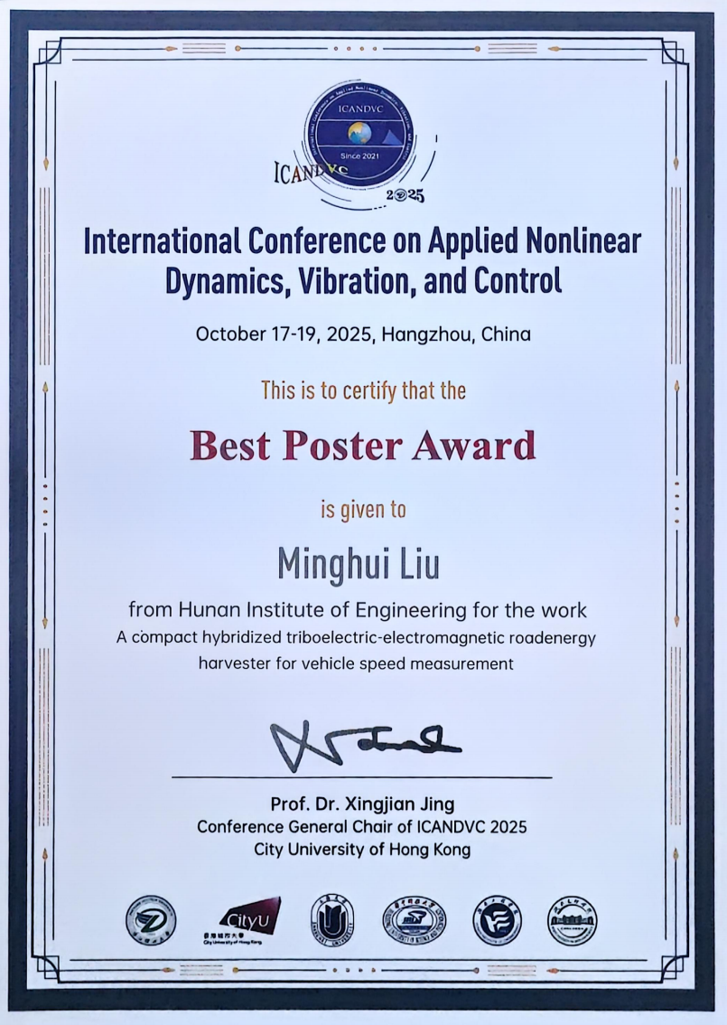 近日,2025年国际应用非线性动力学、振动与控制会议(ICANDVC-2025)在杭州隆重举行。新葡萄官网刘胜副教授指导的硕士研究生刘明惠同学凭借其出色的研究成果,荣获会议“最佳海报奖”。