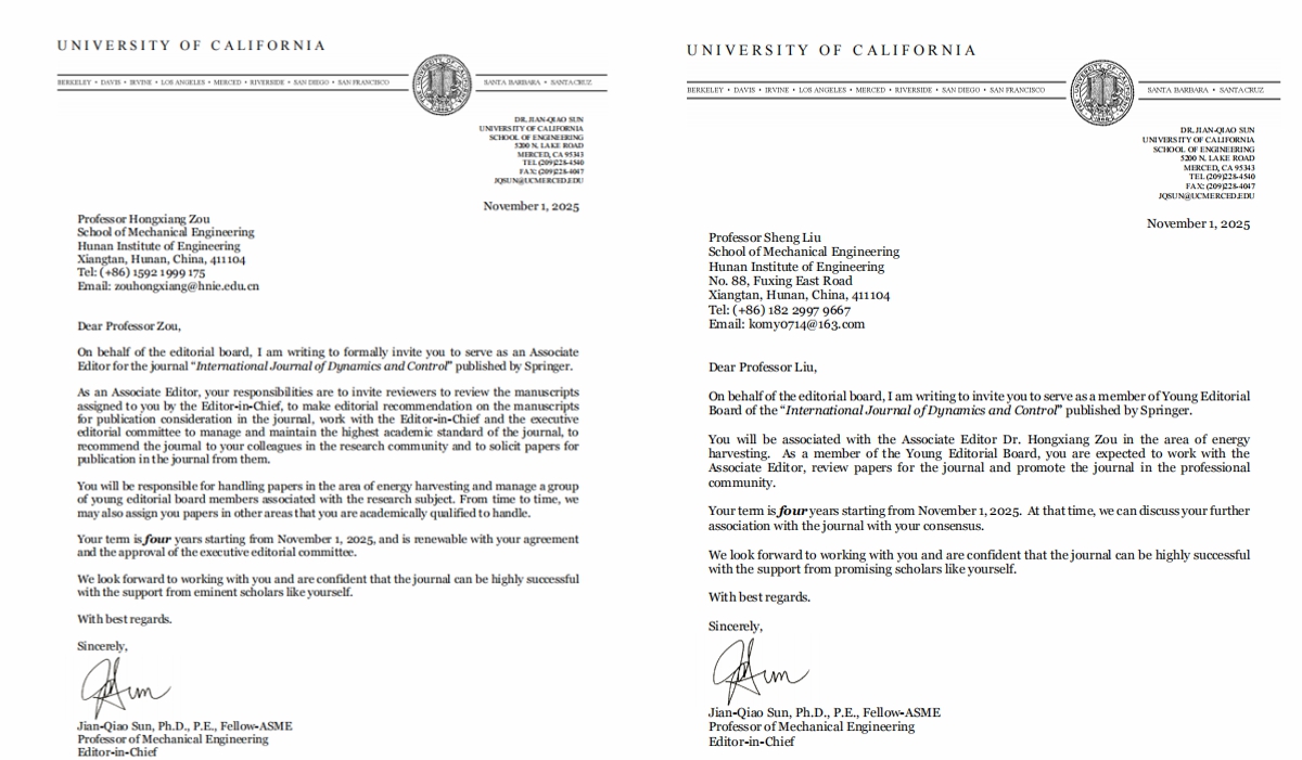 《International Journal of Dynamics and Control》是动力学、振动与控制领域具有重要影响力的国际期刊,致力于发表该领域前沿研究和工程应用的重要成果。两位教师受邀担任期刊学术职务,不仅是对其个人学术水平和声誉的肯定,更将为新葡萄官网动力学与控制研究领域搭建更广阔的国际学术对话平台,助力学院精准对接国际前沿方向,深化与海外高水平团队的合作,推动学科成果走向国际舞台。