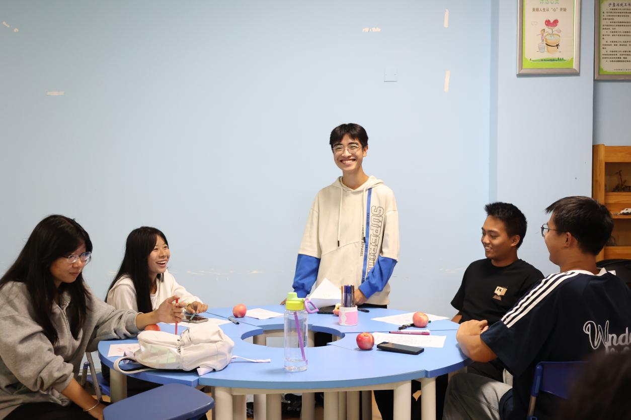 活动伊始,喻艳向学生介绍了本次活动的目的和意义。活动以热身活动“大风吹” 拉开帷幕,学生积极互动,现场氛围变得轻松愉悦。学生随机分成5组,参加“名字滚雪球”小游戏,进一步促进学生间的了解和互动。之后的主体活动“我的苹果”中,各组学生运用视觉、触觉、嗅觉细致观察与感受苹果的特征,并分享自己的体验和感受。“苹果就像我们每个人,都是独一无二的。”“多亏了这个苹果的缺陷部分让我闭着眼睛也可以迅速找到它,其实缺点有时候也可以成为优点。”通过个人探索和小组分享,学生认识到个体的独特性,学会接纳自己和欣赏他人。在“进入大学五个最”和“大学生活拼图”两个纸笔练习活动中,学生们整理进入大学后的感受并学会规划自己的大学生活,成员间相互讨论、碰撞思想,对未来有了更清晰的认识,从而尽快适应大学生活。“很特别” ,“轻松” ,“我从队员的分享中学习到很多”,“我要带领班级同学一起开展这个活动”,本次活动在全体成员分享参与团体活动感悟中结束。